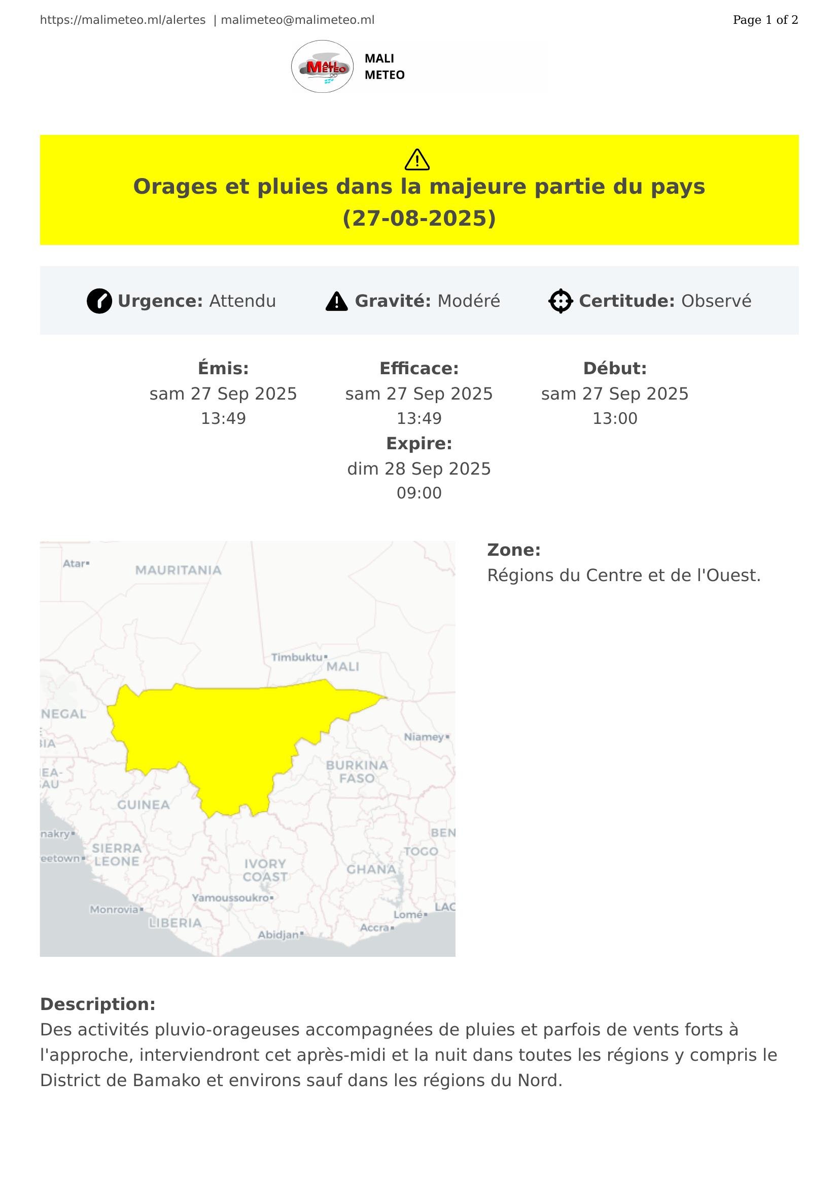 Des activités pluvio-orageuses accompagnées de pluies et parfois de vents forts à l'approche, interviendront cet après-midi et la nuit dans toutes les régions y compris le District de Bamako et environs sauf dans les régions du Nord.